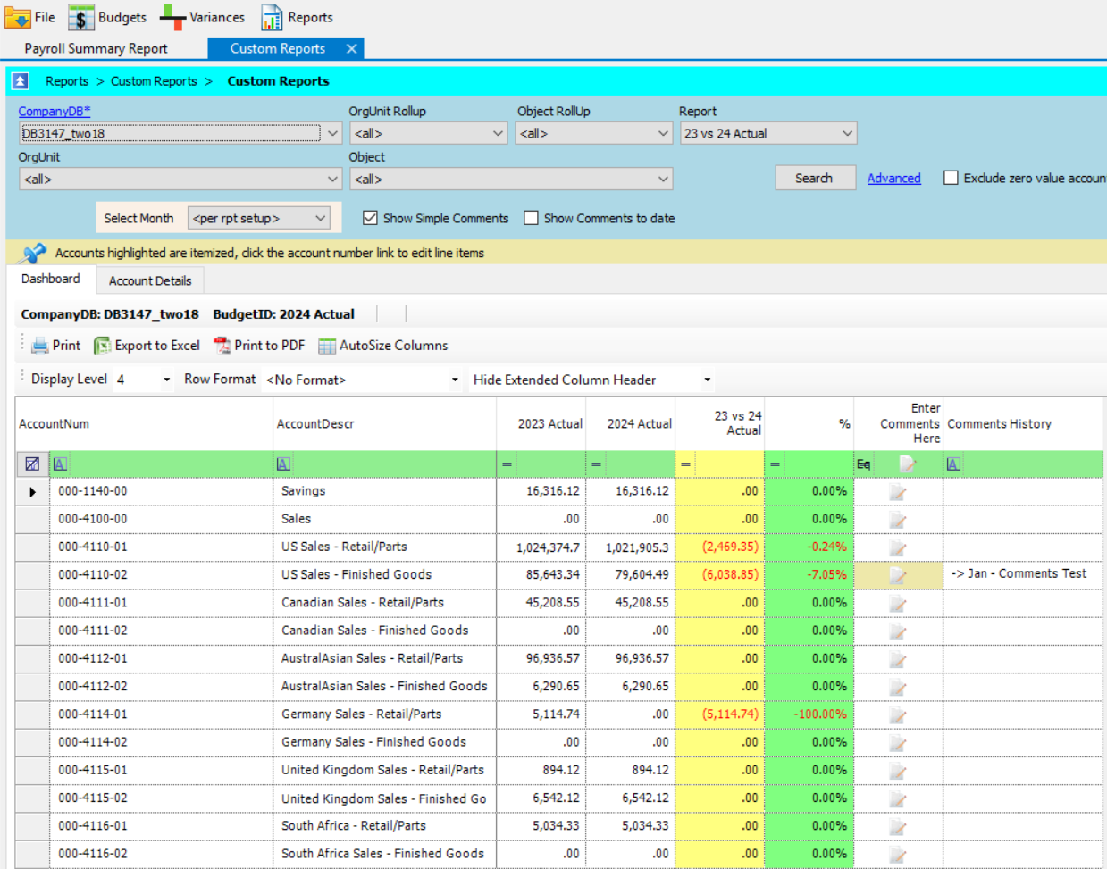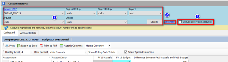 The format of the on-screen data can be customized by using the Display Level, Row Format, Show Roll-up Subtotals and Expand/Collapse Rows.