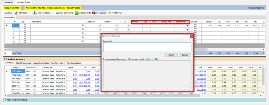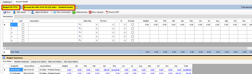 In a Budget column, selecting the "Edit Budget" option will open up the Account Details/Assumption tab.
