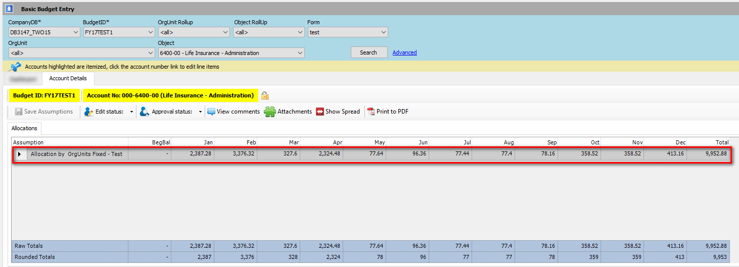 In the below the "G&A" OrgUnit Rollup was selected from Company" DB DB3147_TWO15" and BudgetID" FY17TEST1". And from the "G&A" OrgUnit 100 was selected and is the source of the allocation totaling $223,328.