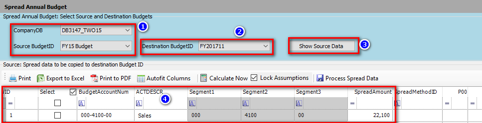 1) Select from the dropdown menus the Company DB and Source BudgetID that you wish to spread - in our example, the FY15 Budget;