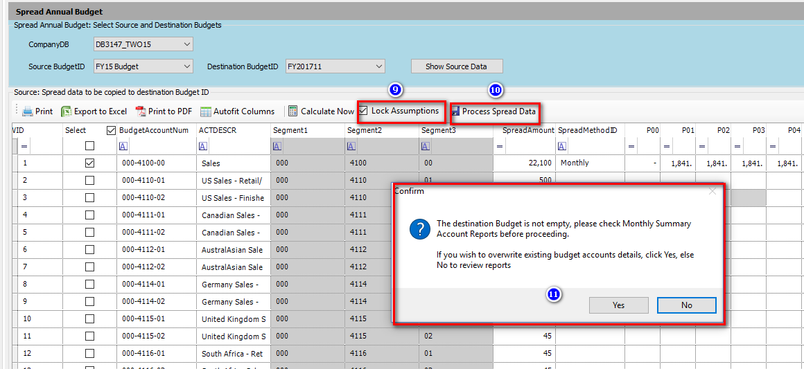 10) Click the "Process Spread Data" button to process the spread data into the Destination BudgetID;