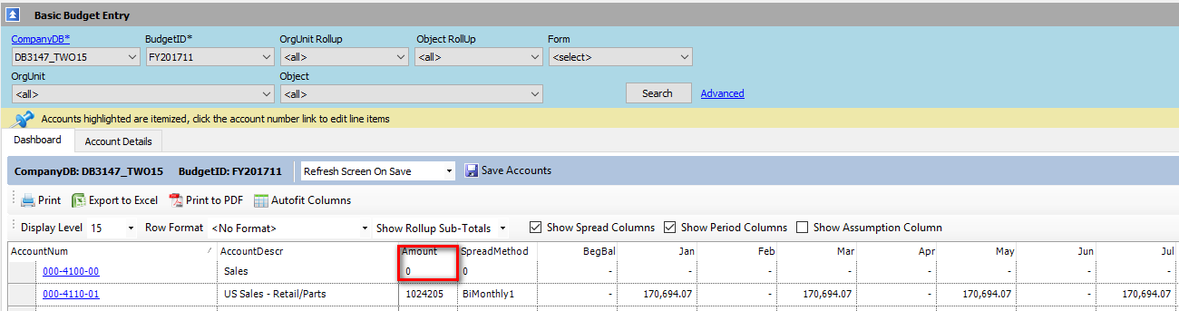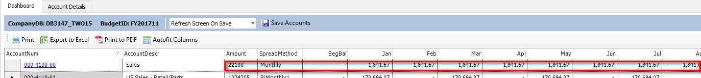 Now if we refresh our search on the FY201711 BudgetID we will note that the $0 has changed to $22,100 spread monthly: